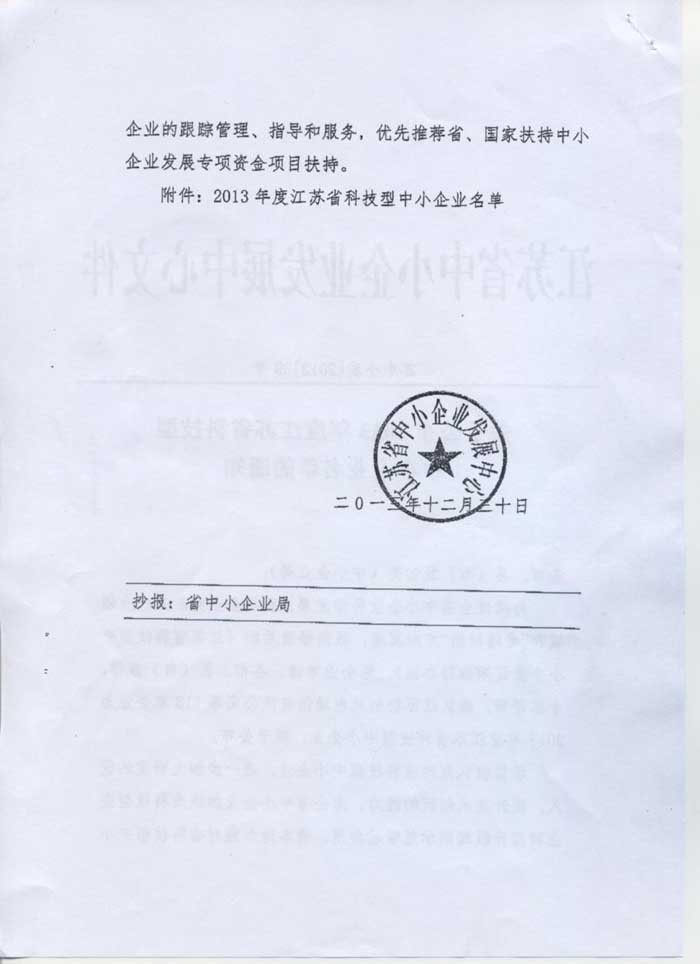 近日,公司通過(guò)江蘇省經(jīng)濟(jì)和信息化委員會(huì)(省中小企業(yè)局)的評(píng)審,被認(rèn)定為“江蘇省科技型中小企業(yè)”。